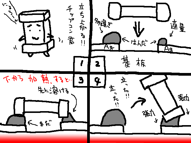 せめて電極のサイズを0.5mm四方まで大きくしておけば、成功確率が多少は上ったかもしれません…。